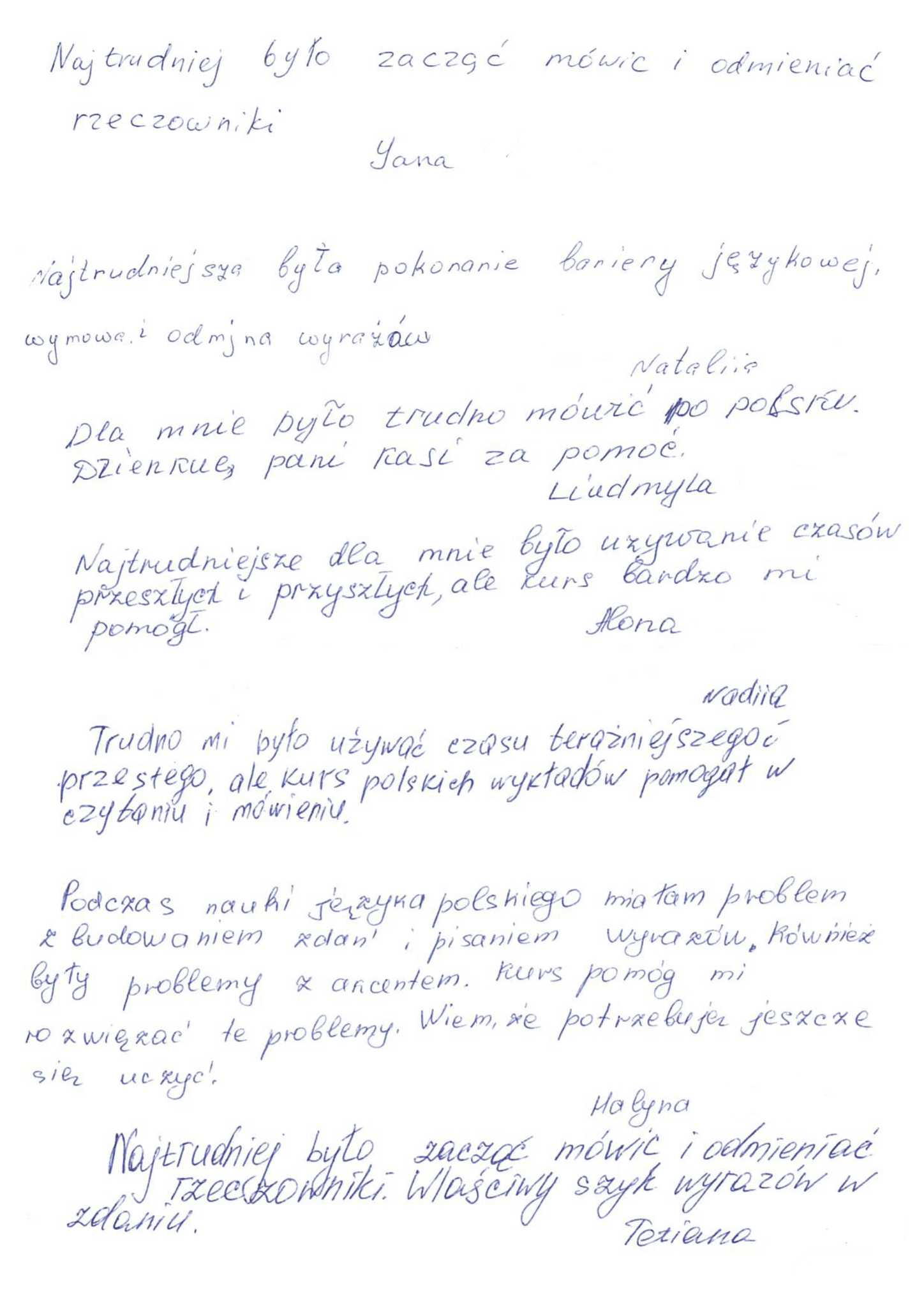Największą trudnością dla uczestniczek kursu jest opanowanie w mowie i piśmie języka polskiego, odmiany rzeczowników, używanie czasów przeszłych i przyszłych. Poniżej publikujemy zachowane w oryginale spostrzeżenia spisane przez uczestniczki kursu.
